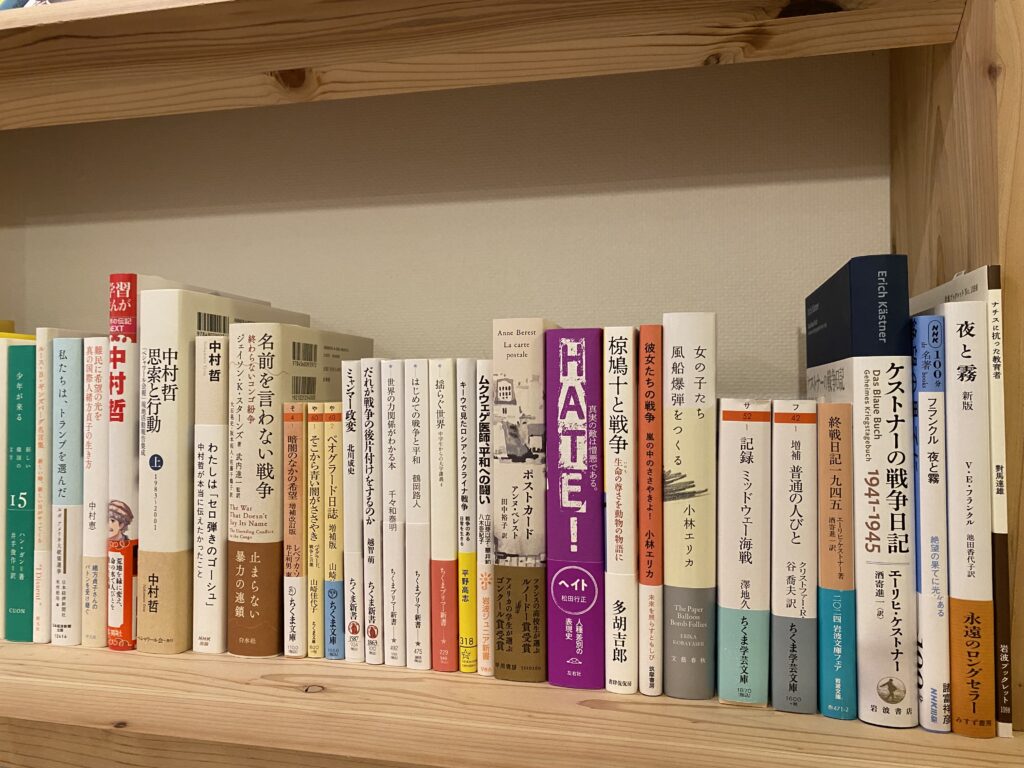 さて、夏休み明け、最初の営業日は15日でした。80年。長い年月です。「先の大戦」を知る人たちも次々に鬼籍に入っていきます。肉声で聞く機会は失われてゆきますが、私たちには本があります。新しく「戦争の苦しみ」を味わう人が増えないよう、本を読んで考えたいと思います。「シェアの入り口」と同じスタイルで、集まった方達のあいだで自然に立ち上がる「戦争についての会話」がいくつか聞けたら幸い。参加費無料、申し込み無用、出入自由です。